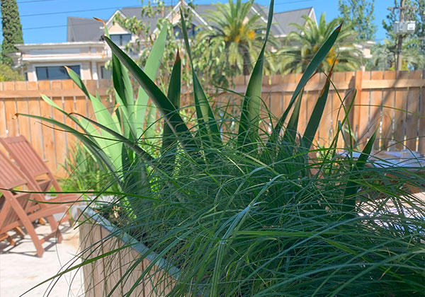 Como un toque extra, ubicamos un conjunto de macetas en el fondo, con vista al fogonero, alma del patio de los eucaliptus.